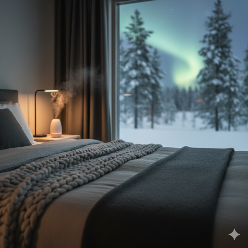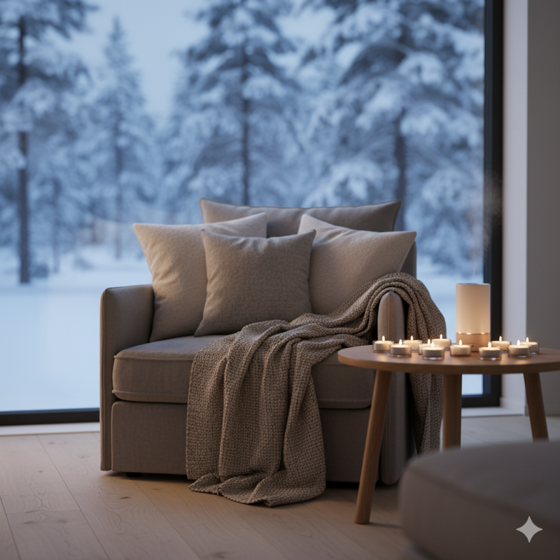 Vad ingår? Extra kuddar och fluffiga filtar, en doftdiffusor och värmeljus för att mjukt lysa upp det nordiska mörkret.