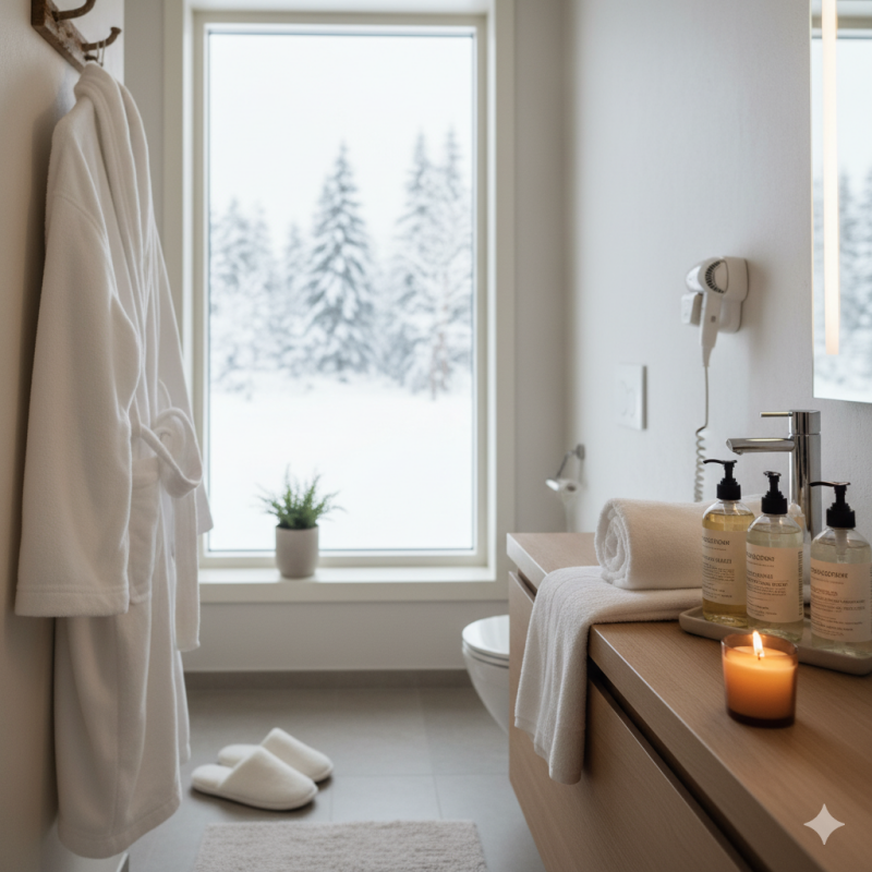 Din fördel: Ren nordisk lyx! Efter duschen kan du glida direkt in i den mjuka badrocken och låta dagen få ett avslappnat slut.